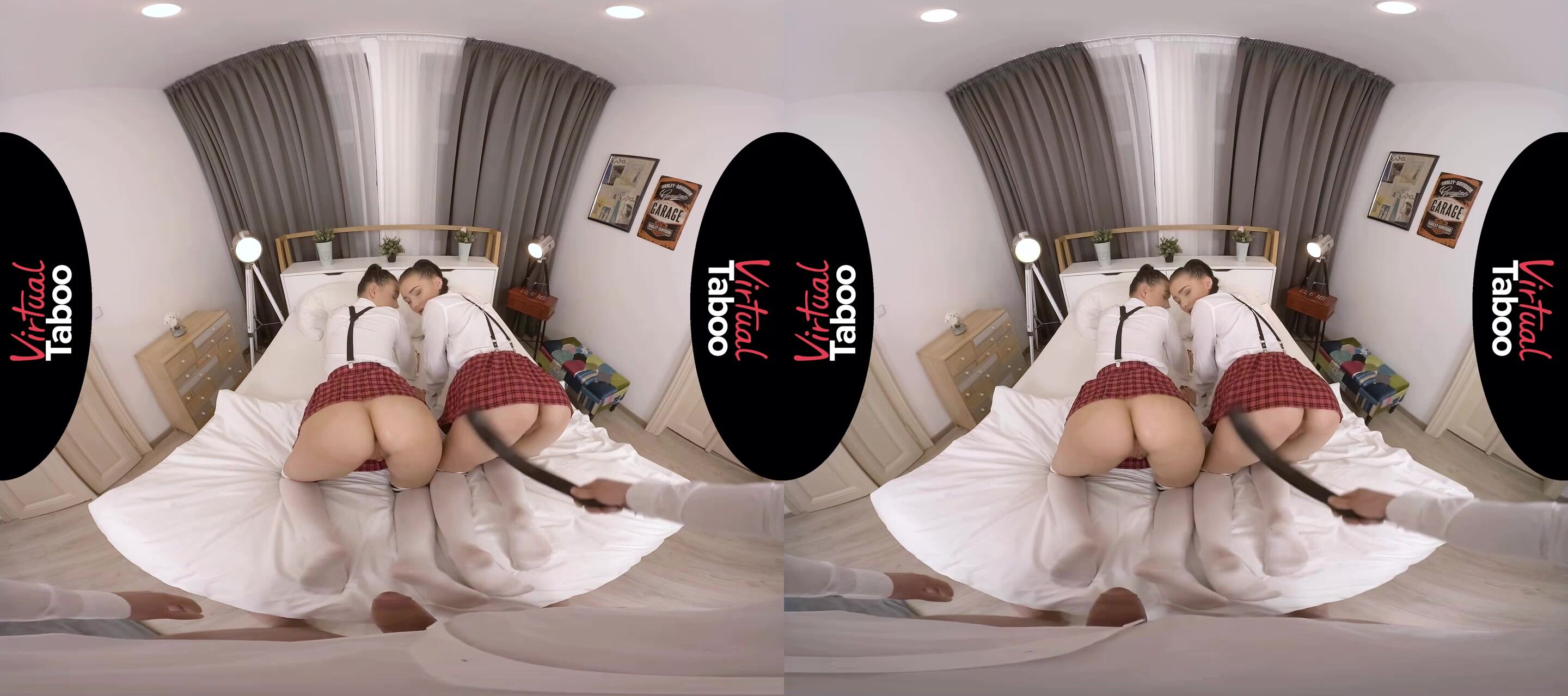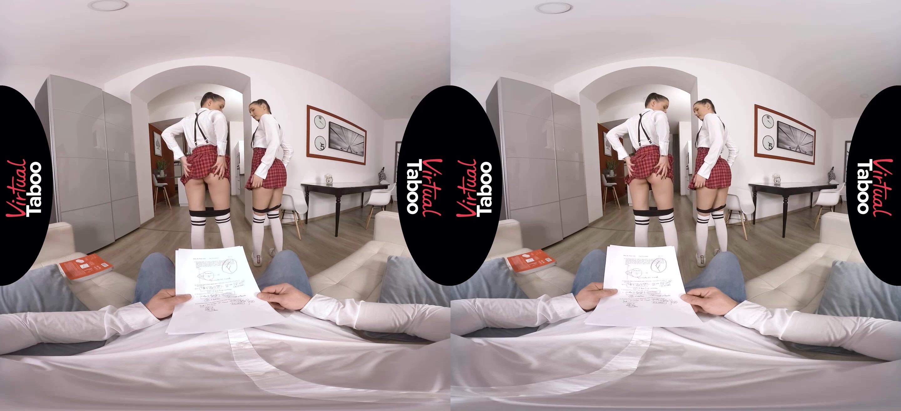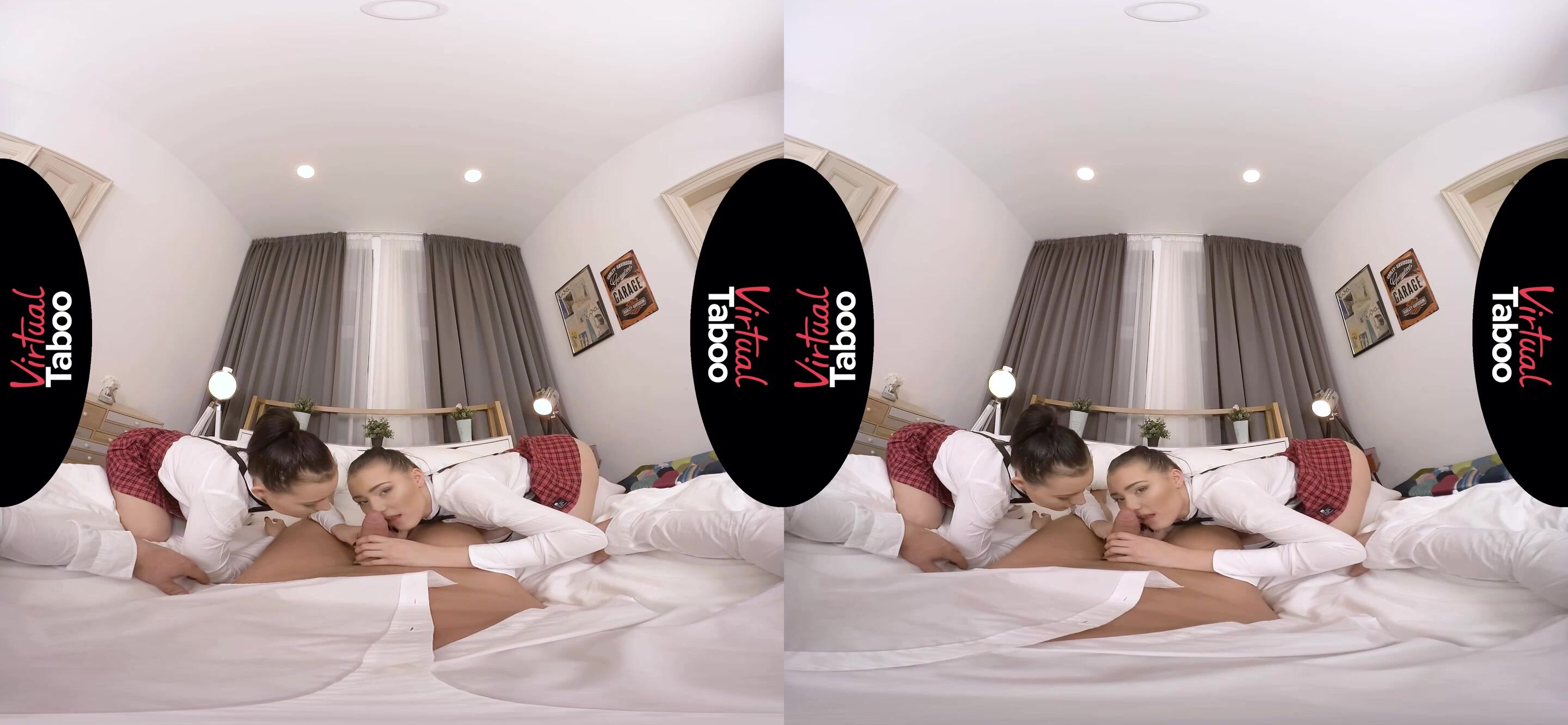 Le sorelle gemelle Lady e Sandra tornano a casa con delle brutte notizie. I loro voti del semestre non sono solo pessimi, sono orribili. Le ragazze sono state troppo impegnate con le cheerleader e a rincorrere i ragazzi al college per concentrarsi sui loro studi. Sanno che la loro madre molto severa si arrabbierà e porterà via loro i telefoni e tutte le attività extrascolastiche finché non saranno aumentati i loro voti. C'è solo un modo a cui riescono a pensare per stare fuori dai guai: chiedere aiuto al loro patrigno più permissivo. Lui può calmare la madre. Le gemelle devono solo trovare un modo per convincerlo a stare dalla loro parte nella situazione. Escogitano un metodo molto non convenzionale per ottenere la sua influenza. Appariscenti carine nelle loro uniformi scolastiche abbinate, Lady e Sandra si inginocchiano e implorano l'aiuto del papà, promettendo un pompino se lui aiuterà a convincere la madre a non punirle. Lui non può rifiutare un'offerta del genere e si gode le loro due bocche affamate mentre si passano il cazzo avanti e indietro. Papà ama il modo in cui succhiano, ma le porta in camera da letto per punirle con la sua cintura. Sculaccia i loro culi, ma è scopare quello che vuole davvero. I loro piccoli culi sono stretti, ma le ragazze imparano la lezione grazie al suo grosso cazzo che spinge. Papà non aveva idea di quanto fossero diventate cattive le gemelle. La ragazza avvicina la faccia e poi succhia il suo cazzo direttamente dal buco stretto del culo della sorella. Lo masturbano insieme e si dividono una grande sborrata sui loro bei visi. Lui non dirà alla madre dei brutti voti, ma le gemelle devono accettare delle sessioni di tutoraggio giornaliere con il cazzo di papà.